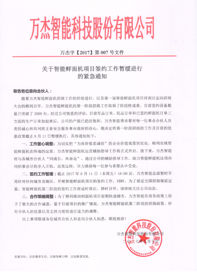 敬告各位意向合伙人: 隨著萬杰智能鮮面機招商工作的持續進行,以及第一屆智能鮮面機項目河南區定向招商大會的順利召開,萬杰智能鮮面機的第一階段招商工作取得了階段性成果,目前簽約設備數量已突破了2000臺。經過公司慎重的評估,目前軍品訂單、民品訂單和已簽約鮮面機訂單三方面的生產訂單加起來后,公司的產能已趨近飽和。萬杰智能秉承著對每一位事業合伙人負責的誠心和共同將主食安全服務事業做好的決心,現決定將第一階段招商的工作及目前的優惠政策截止8月11日暫緩執行,具體通知如下: 一、工作重心調整:為切實把“為客價值忠誠信”的企業價值觀落到實處,順利實現智能鮮面機在終端的運營,萬杰智能鮮面機運營輔助指導工作將正式開啟。接下來,萬杰智能將與各城市合伙人“同成長,共命運”,通過公司的輔助指導工作,助力智能鮮面機這項共同的事業盡快步入正軌,高效運轉,盡力確保每一位參與者都從中受益。 二、簽約工作暫緩:截止2017年8月11日(本周五)18:00后,萬杰智能總部暫時不再針對任何城市及地區,開展智能鮮面機項目的簽約工作。同時,為了保證全國招商保質定量,智能鮮面機第二階段的簽約工作將適時推后,擇時召開,請持續關注公司動態。 三、合作策略調整:為了順利推動制面機項目前期快速鋪市,萬杰智能在商務政策上給予了很大的合作誠意,鑒于目前項目的推廣情況,萬杰智能鮮面機第二階段的招商政策、針對合伙人的優惠以及支持力度將進行適當的調整。 以上事項敬請各位城市合伙人和意向合伙人知悉,順祝商祺!